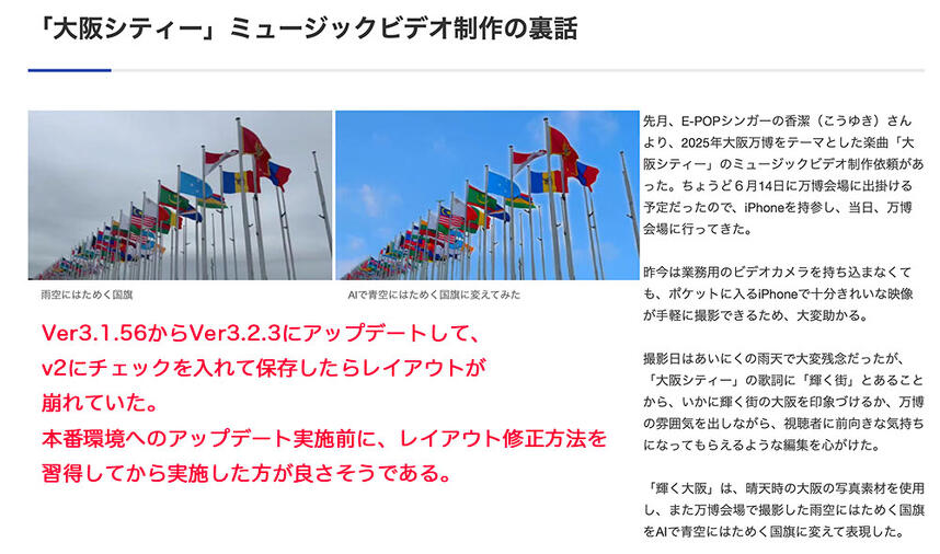 再度v1に変更したところ、正常に戻ったページもあったが、レイアウトが崩れた状態のページも散見された。