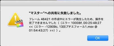 途方に暮れて、マスター(mov)への共有(書き出し)を試みたら、同じようにエラー表示がでて、書き出しができない。