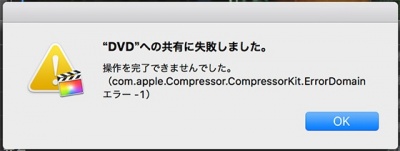 「com.apple.Compressor.CompressorKit.ErrorDomainエラー-1」のエラー表示が現れて、DVDに書き込めない。