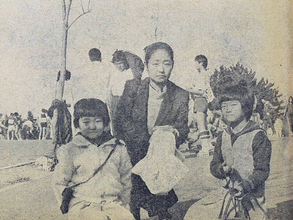 学校から帰ってきた亜紀代(あきよ)ちゃん(横須賀小学校3年)、扶水代(ふみよ)ちゃん(横須賀小学校1年)の姉妹が「こんにちは」と言って客間に顔を出す。「さ、こっちへすわって静かにしてな」と言う蟹江選手は、一瞬お父さんの顔になる。