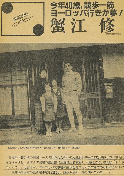愛知県平和公園の周回コースで行われた今年の元旦競歩10kmで43分30秒0の日本新記録をマークし、ますます健在の蟹江修(三菱自工名古屋)。40歳となり、本人は「もうきつくって・・・」と言うが、ヨーロッパで本場の競歩を見てくるまではやめられそうにもない。愛知県東海市の蟹江選手宅を訪問し、競歩人生の一端を聞いてみた。