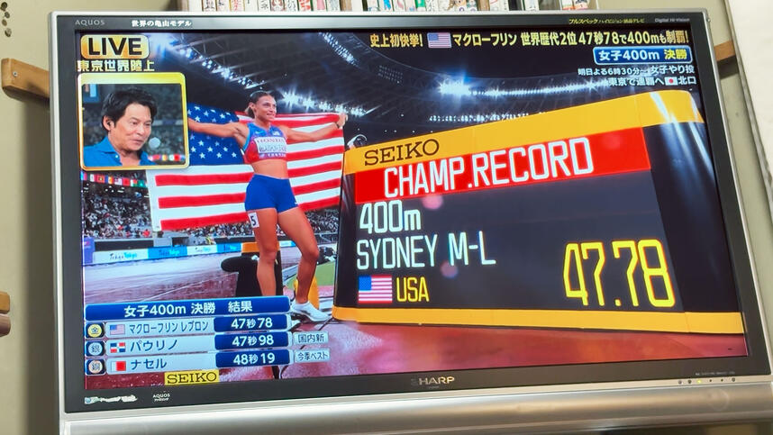 男子400m決勝では、中島佑気ジョセフ選手が44秒62で6位入賞を果たした。1991年東京大会での高野進選手の7位を上回った。第4コーナーでは最下位だったが、残り50mから7番手との差を縮め、ゴール手前で2人を抜き去る大健闘を見せた。
