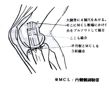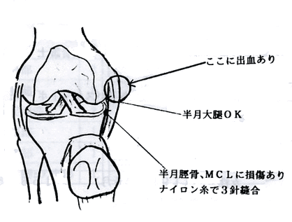 平成2年6月11日、台湾遠征中の試合で左膝受傷する。プレー続行不可。アイシング&テーピングにて対処。6月12日帰国。6月13日当所受診。関節穿刺血性15ccあり。左膝内側側副靱帯損傷および前十字靭帯損傷の疑いにて手術勧められ、当所即日入院の運びとなる。