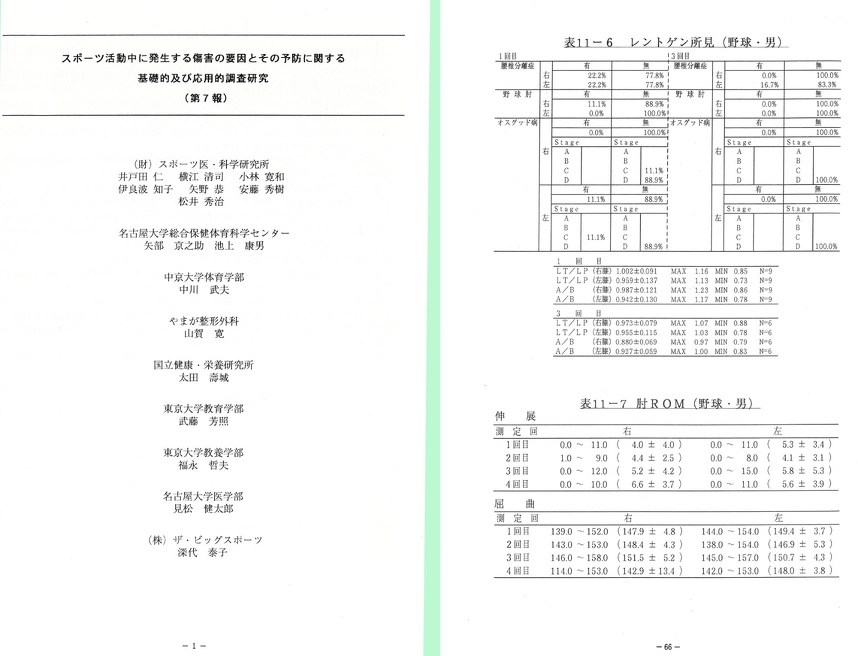 以上の内今年次でオスグッド病と野球肘に焦点を絞り、オスグッド病に関しては臨床例102例と、某中学校新入部員126名について、X線検査による脛骨粗面の骨発育を基準にして、その発生時期について検討を加えた。また野球肘に関しては、某中学校野球部新入部員20名全員について肘関節X線検査を経時的に行い、骨端核の変化について検討したので、その結果をオスグット病については症例研究と発症要因の二編に、野球肘については肘関節のX線像の検討を中心にまとめ報告書とした。