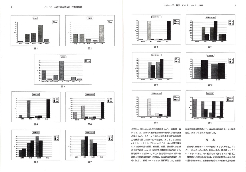 井戸田仁の論文は、本研究所診療部における診療例の多いスポーツ選手の膝関節靭帯損傷、特に前十字靭帯損傷に関するものであります。 前十字靭帯損傷はスポーツ活動を続ける上での致命的外傷であり、その治療の良否は選手達のスポーツ生活を大きく左右します。このことからその損傷の治療に関する研究は早くから見られ、近年ではスポーツ種目別の治療研究報告が公刊されています。本論文はその一つに加えられるハンドボール選手群の治療に関する知見であります。 すなわち、 研究所診療部において前十字靭帯損傷を治療した38名のハンドボール選手患者について診断(受傷状況、合併損傷)と治療 (手術治療、保存的治療) の成績と、そこでの治療についての知見をまとめたものであります。
