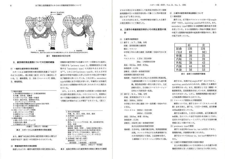 伊良波知子、小林寛和等の論文は疲労骨折部位としては稀とされている骨盤部疲労骨折の発生要因を究明したものであります。 疲労骨折は過激な或るいは不適切なトレーニングの継続にともなって起こる骨傷害であります。 稀な対象例となった2選手はいづれも優れた成績を持つ女子マラソン 長距離選手であります。かかる症例についての発生要因の究明は傷害を未然に防止するための重要な礎石であり、本論文はその一石として評価されましょう。