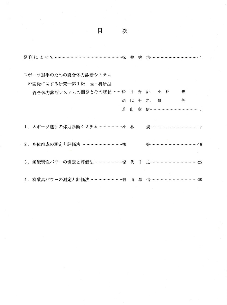 論文は目次に示しましたようにシステム構成にかかるものと、これらシステムを構成する主要体力指標にかかわる測定と評価法に関する3つの論文の4論文を集録しました。