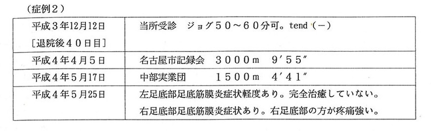 退院後、 〈症例1〉 ではしばらくしてから腸脛靭帯炎を患いランニング中止を余儀なくさせられた。 会社内診療所の看護婦から「陸上競技をやめたほうがいい」 と言われたそうで、 本人はどん底におちいったそうである。 腸脛靭帯炎の症状が緩解した12月下旬から練習を再開し、 新年あけてからは練習の質を高めていった。 そして本年の4月26日の群馬リレーカーニバル5000mでは16分29秒2と自己のもつ記録を10秒あまりも更新してしまった。 今では嘘のように足底筋膜炎の症状が消失してしまっている。 本人は腸脛靭帯炎を患ったのが幸いしたと分析している。