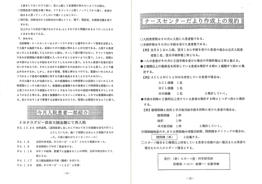 当診療部はスポーツでケガをした選手がスポーツ復帰を目的として入院する施設である。 真剣にケガの克服に努めることが大切である。入院患者はこのことを自覚していただく必要がある。 そういう気持ちであれば夜間他の患者の部屋に入ったりすることはないように思う。