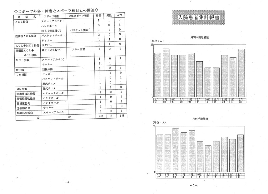 ● 今月はACL再建の手術5件と多かった。 例年この月だとスキーにてACL損傷するケースが多いが、スキー1件、あとは球技種目にての受傷は意外であった。 それにしてもどうしてこんなにも多くの人が前十字靱帯を切るのか不思議でならない。これでジャスコハンドボールチームは3人目。 東芝のバスケットチームも3人断裂して当所で手術している。
