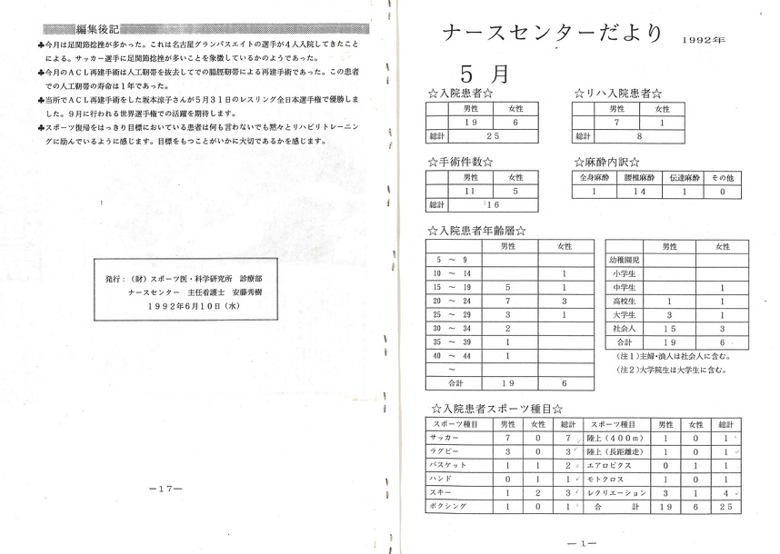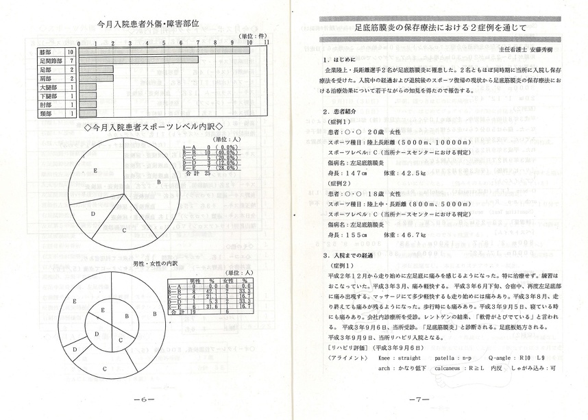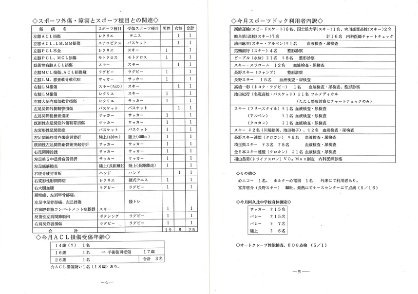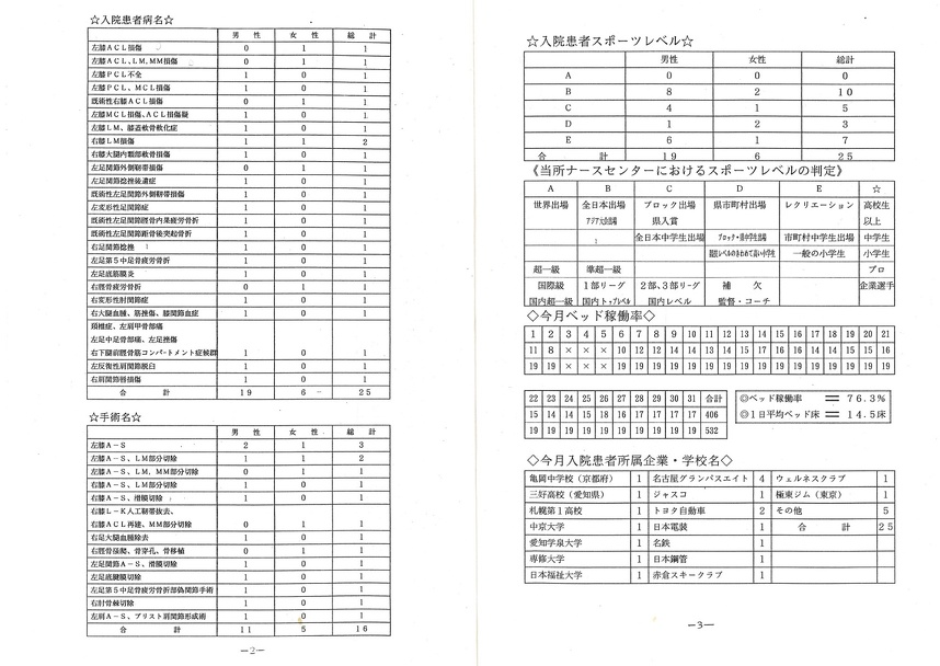 ● 今月は足関節捻挫が多かった。これは名古屋グランパスエイトの選手が4人入院してきたことによる。 サッカー選手に足関節捻挫が多いことを象徴しているかのようであった。