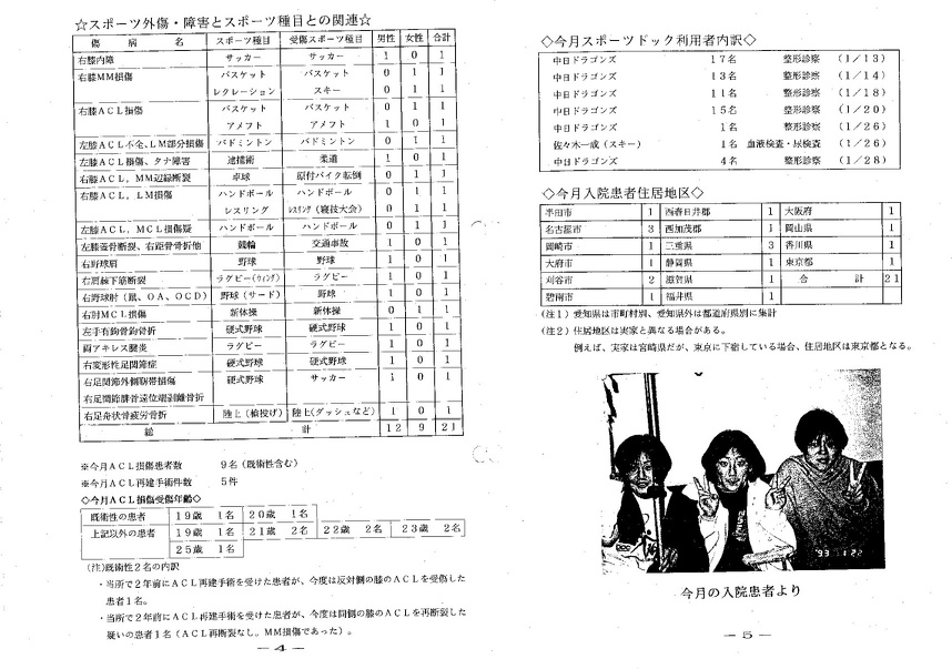 ● 外来に訪れる患者さんで思ったことですが、前十字靱帯損傷の選手が多いという事実です。どうしてこんなにも多いのか不思議です。選手は医師から「重症な傷病だ」と説明されても、はじめはピンとこないようです。「スポーツを続けたいのであったら手術が必要」と説明されて、はじめて怪我の症状の重いことを認識するようです。