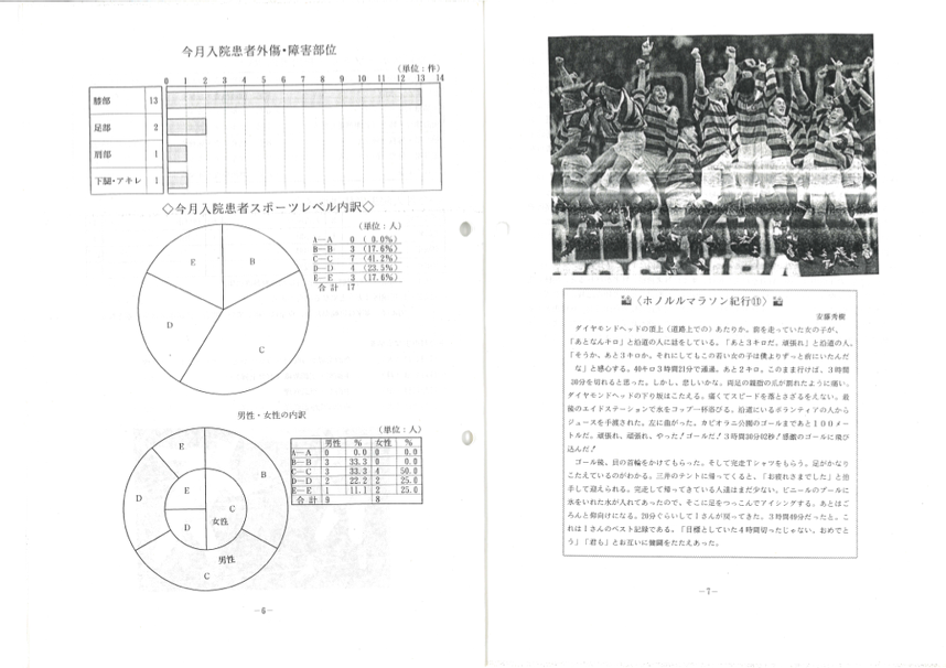 ● 久しぶりに、天気のすこぶる良い日に、患者さんといっしょに外に散歩にでかけました。ゆっくり話もできましたし、のどかなグラウンドを目の前にくつろぐことができました。以前、スポーツ医・科学研究所がオープンした頃は、このような時間が、勤務時間内に結構ありました。 最近は、手術日には必ず手術が入りますし、外来も利用者が増えています。また、阿久比高校身体計測などもあり、 毎日が業務をこなすだけに終始しているように思います。 昔が、ちょっぴりなつかしく思いました。