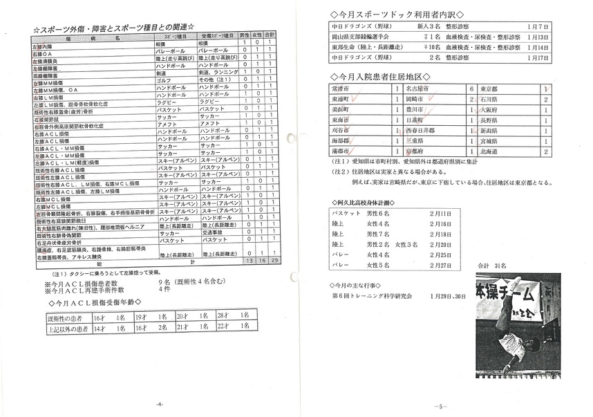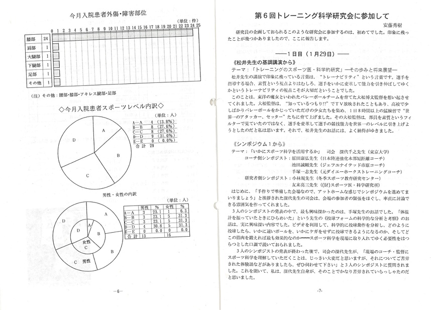 ● 昨年の6月に膝の前十字靭帯再建手術を受けたハンドボールの女性選手が、 術後2ヵ月目頃から膝に水が溜まるなど、 膝の調子が思わしくなく、 今回、 抜釘手術も兼ねて、 膝関節鏡の手術目的で入院してきました。手術では、瘢痕、滑膜などを切除して、膝の中をきれいに掃除しました。