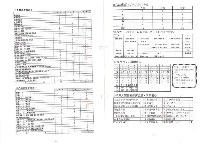 ● 今月は、ベッドの稼働率は低かったのですが、 入院患者数は29名と過去2年間の中では最高でした。これは、年末から新年にかけて外泊予定であった患者が、年末に一時退院し、新年になってから、再入院(リハ入院)した患者が3名いたこと、他にリハ入院の患者が7名いたこと、 また、入院期間が4〜7日間の短期入院患者が 7名いたことによるものです。