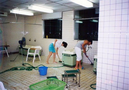 ● 春になって、あるポカポカ陽気の午前に、入院患者10数名が当研究所西側の駐車場でマットをそれぞれ敷いて一生懸命に腹筋と背筋のトレーニングを行っていました。
