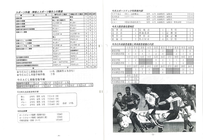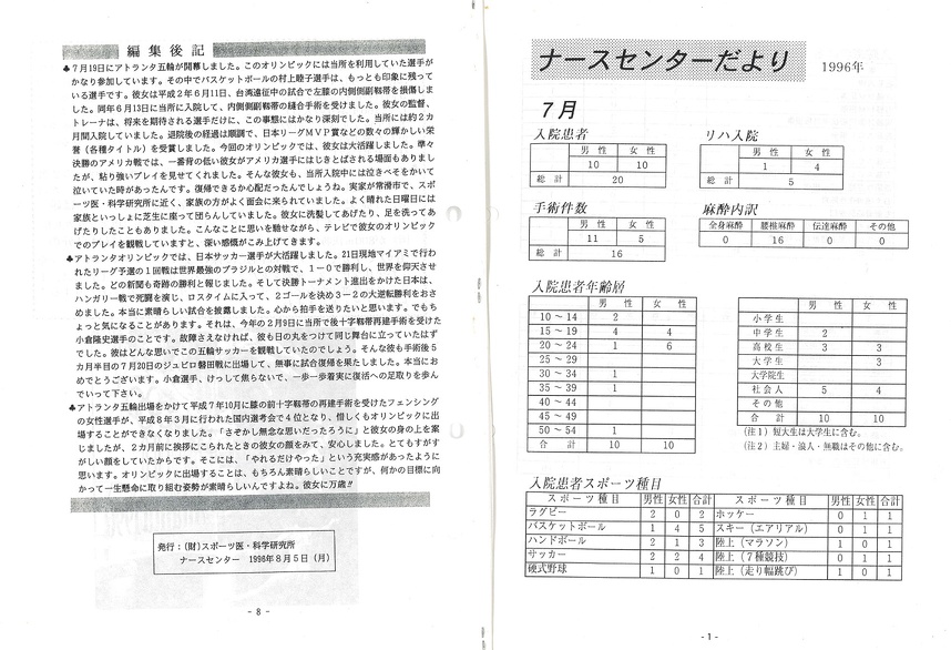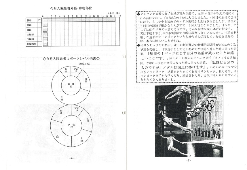 ● アトランタ五輪出場をかけて平成7年10月に膝の前十字靱帯の再建手術を受けたフェンシングの女性選手が、平成8年3月に行われた国内選考会で4位となり、惜しくもオリンピックに出場することができなくなりました。 「きっと無念な思いだったろう」と彼女の身の上を案じましたが、2カ月前に挨拶にこられたときの彼女の顔をみて、安心しました。