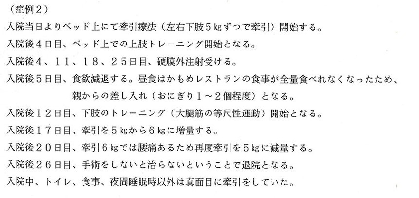 (症例2) のケースは個室でテレビがあった。 牽引時間の記録ノートを手渡し牽引時間をチェックしてもらった。 またリハビリ室でのトレーニングも少しだが実施した点で (症例1)よりは比較的牽引しやすい環境であったろうと思う。 しかし、それにしても非常に真面目に牽引していた。 『この牽引治療で治したい』という強い気持ちの表れであったように思えた。