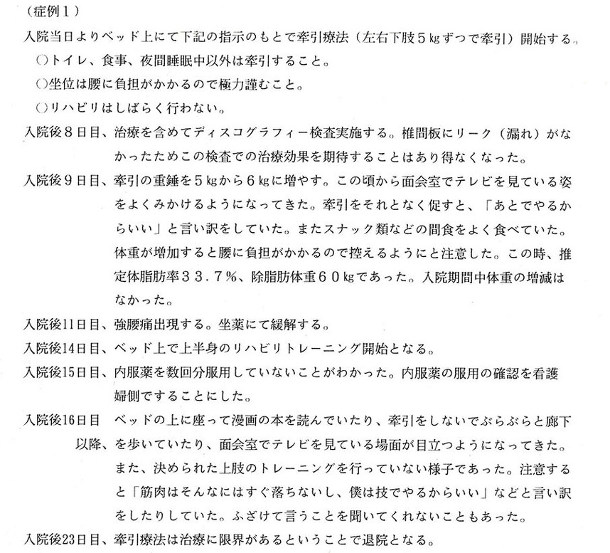腰部以外に健康な患者が、食事、トイレ以外は始終ベッド上で牽引することを強いられることは、肉体的にも精神的にも大きな苦痛であろうと思われる。 その顕著な例が、 (症例1)のケースではないかと思う。 牽引しないでやたらと廊下をぶらぶら歩いたり、長い間面会室で座ってテレビを見ていたりしていた。 牽引しなくてはいけないと思ってはいるのだろうけど、じっとしていられなかったのだろう。こんな患者に 「牽引しなくてはいけない」 と話をしても『わかっているから』と疎まれるのがおちだろうと思う。 『病識がわかっていないから牽引しないのだ』と思って、一生懸命病識を理解してもらおうと説得しようとすることは感心することではない。 いかに苦痛なく牽引できるのかを考えなくてはいけない。 まず第1に1日中牽引するということは耐えられるものではないと考えた方が良い。 「牽引を1日中していなさい」 と話をするのではなくて、「2〜3時間を一つの区切りとして牽引して下さい」と話をした方が小さな目標をもてるという点で良いかと思う。 また、 牽引時間の予定をあらかじめ本人に計画させて、実施した後でどうだったかをいっしょになって考えてみることは本人の励みとなって良いのではないか。 また、当病棟での二人部屋にはテレビがないので、このような患者には特別にテレビを設置するとかすれば、ある程度退屈せずに牽引することができるのではないか。 上肢・下肢のトレーニングを病室でするばかりではなくて、 たまにはリハビリ室でするとかすれば気分転換になって良かったのではないだろうか。