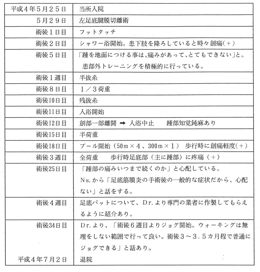 当所で足底筋膜炎の手術を受けた長距離走選手の入院中および退院後の経過について報告します。