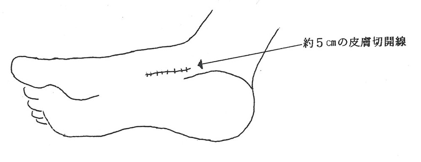 足底筋膜を踵骨起始部で幅1cmにわたり切除する(皮切は足底と足背移行部に約5cm 横切)。