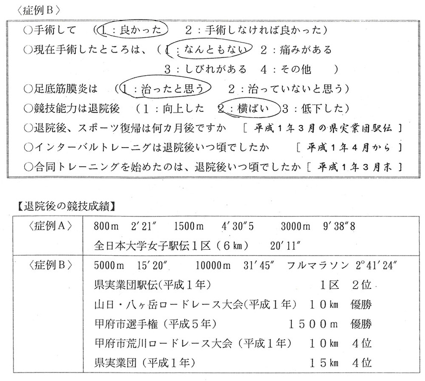 手術後の経過は、術後3カ月までは、踵部にピリピリした感じ、つっぱり感がある。その後症状は消失し、術後4〜5ヵ月目でスポーツ復帰している。 アンケートから、3例の長距離走選手は完治していることがわかった。