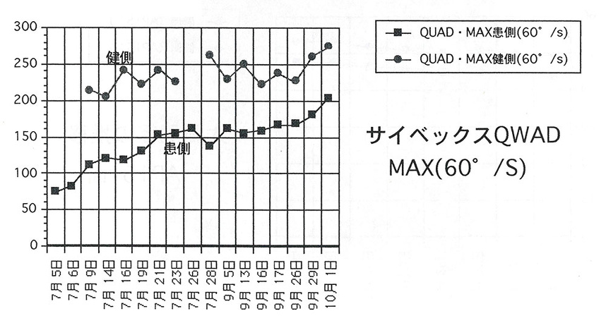当所入院中、大腿筋力はトレーニング効果によって、確実に増大していきました。 そしてその筋力は健常一般人の筋力よりもはるかに優れたものでした。