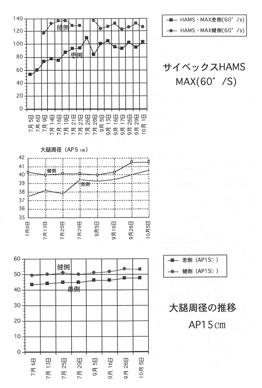 患側サイベックスの値は入院時の頃より倍になっている。 「頑張って屈曲がスムーズに130° になるようにしましょう。 130°になったら、膝のゆるみをみて、どの靭帯を手術するのか決めましょう」(主治医)