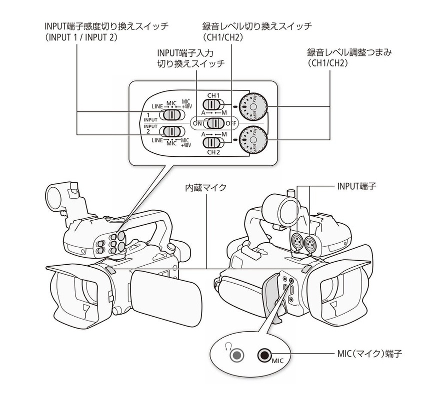 Canon ビデオカメラXA60・ハンドルユニットINPUT1端子とINPUT2端子にキャノンを接続して、外部ラインで音声を収録したいのに、何故か内蔵マイクの音も拾っている。