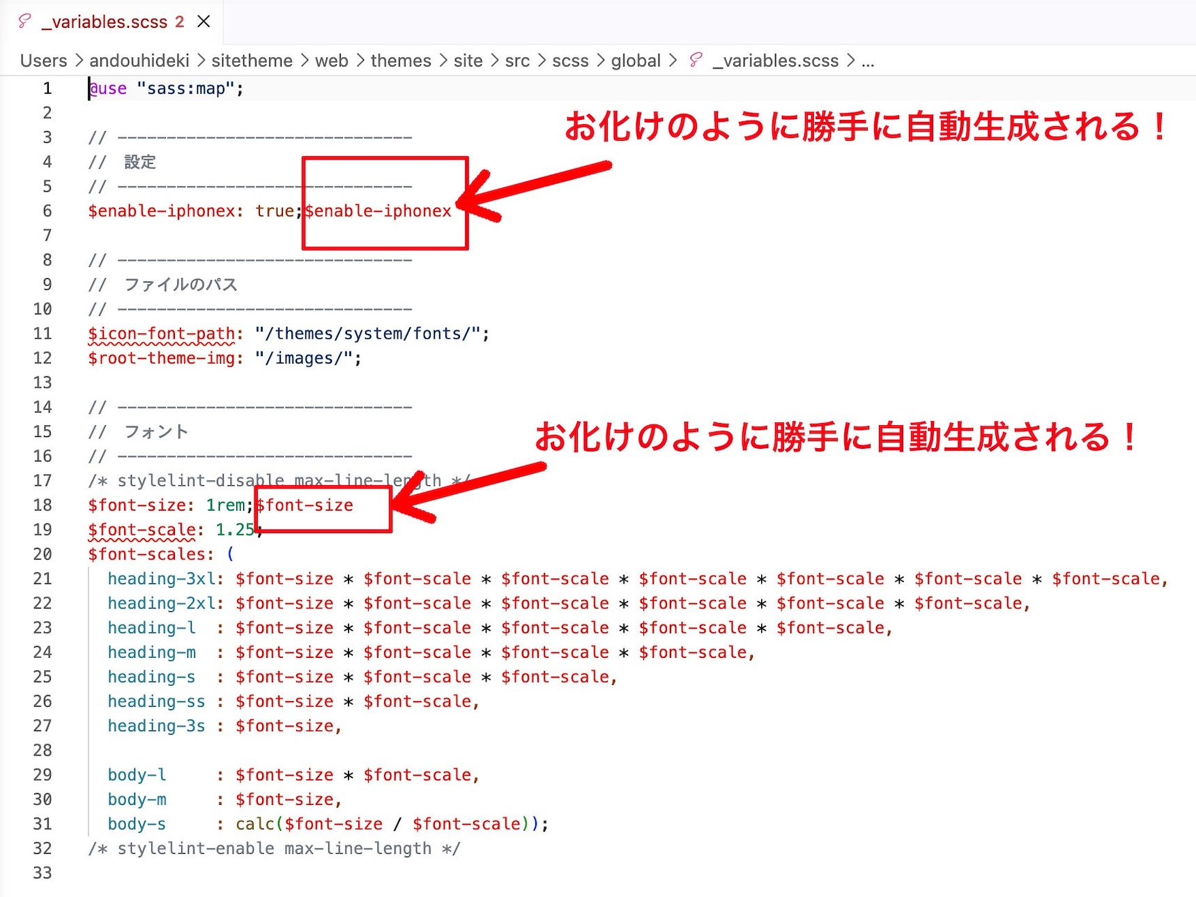 原因は、src/scss/global/_variables.scss に現れる「お化け」です。$icon-font-path などの変数が、消しても消してもビルドのたびに自動生成(重複)されてしまい、エラーを起こして止まってしまうのです。