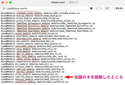 ※ command + F で「#LoadModule rewrite_module 」を検索すると、すぐに見つけることができる。
