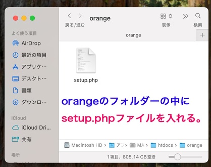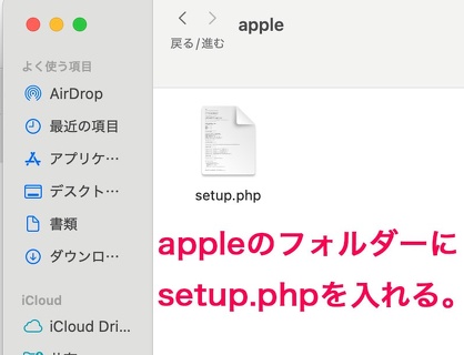 htdocsのフォルダー内に作成したappleフォルダーの中に、ダウンロードしてきた「setup.php」ファイルを入れる。