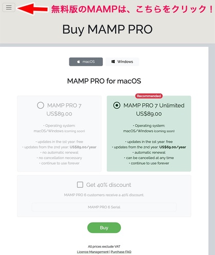 クリックすると現れる画面には「MAMP PROを購入しよう!」と書かれている。