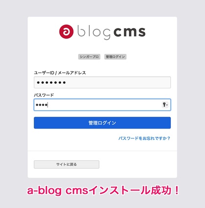 最後に管理画面に入るページが現れて、無事にa-blog cmsがインストールできたことが分かる。
