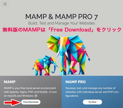 MAMPのサイトが現れる。「Free Download」のボタンをクリック。するといきなりダウンロードしてくる。
