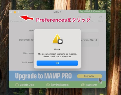 「document ルートが見つからない。設定を確認してください。」の警告なので、左上のPreferencesをクリック!