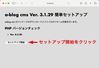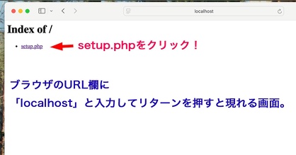 ブラウザーを立ち上げて、URL欄にlocalhostを入力してリターンすると、Index of/ ・setup.phpと表示が出てくるので、setup.phpをクリック!