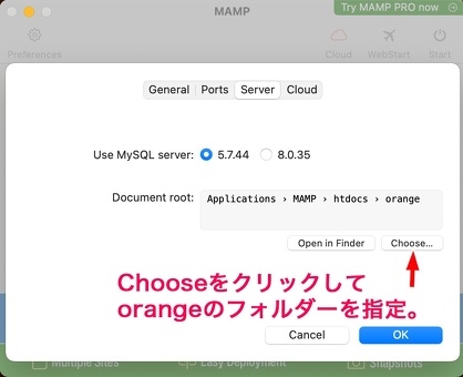 MAMP Preferencesの中の上の「Server」タブを開いて、Chooseボタンをクリックして今、作成した「apple」フォルダーを指定する。