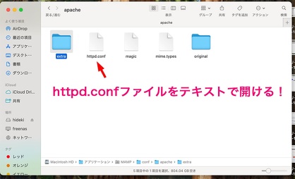apacheフォルダーの中にhttpd.confファイルがあるので、そのファイルをテキストで開けて修正作業。