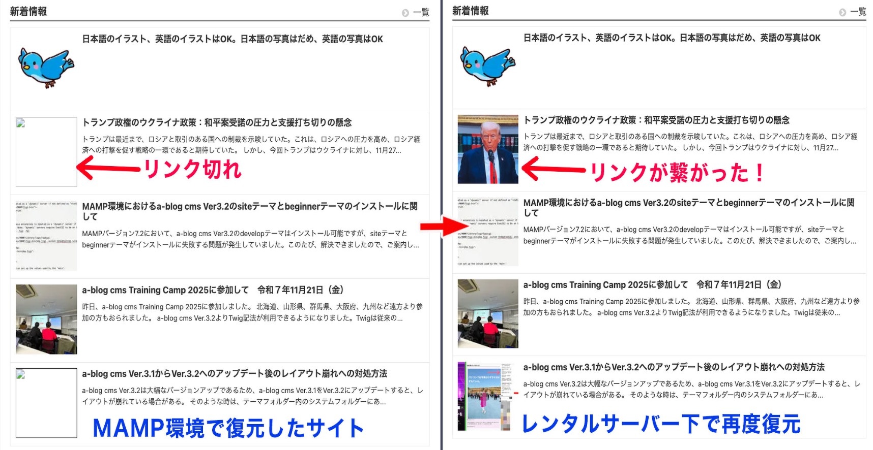 MAMP環境下でリンク切れが発生している状態でリストアされたサイトのmediaフォルダーとarchivesフォルダーには、写真とイラストデータが適切に保存されていましたが、その環境下でのサイトをバックアップして、それをレンタルサーバーに構築したa-blog cmsのサイトにリストアすると、果たして正しく反映されるだろうか? そのことを検証してみました。