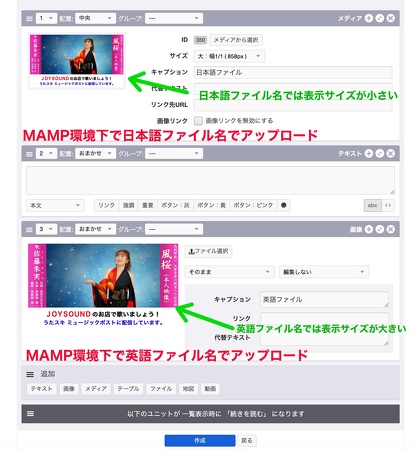 MAMP環境において、テストエントリーとして日本語名の写真ファイルと英語名の写真ファイルをアップロードして保存すると、表側(出力側)では日本語名の写真ファイルはリンクが外れて反映されていませんでした。作成時においては、アップロードした日本語名ファイルの図柄は小さく、英語名ファイルの図柄は大きく表示されていました。