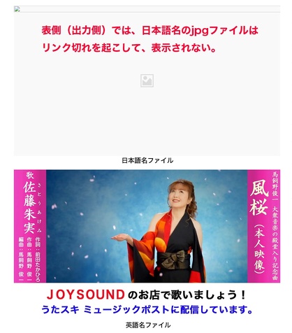 試しに18,278 バイト(ディスク上の20 KB)の鳥のイラストを日本語名と英語名でそれぞれアップロードしてみると、リンク切れを起こさずに正しく反映されたため、イラストではリンク切れを起こさず、写真ではリンク切れを起こすのかとも考えましたが、アップロードするファイルサイズにも影響があるかも知れません。