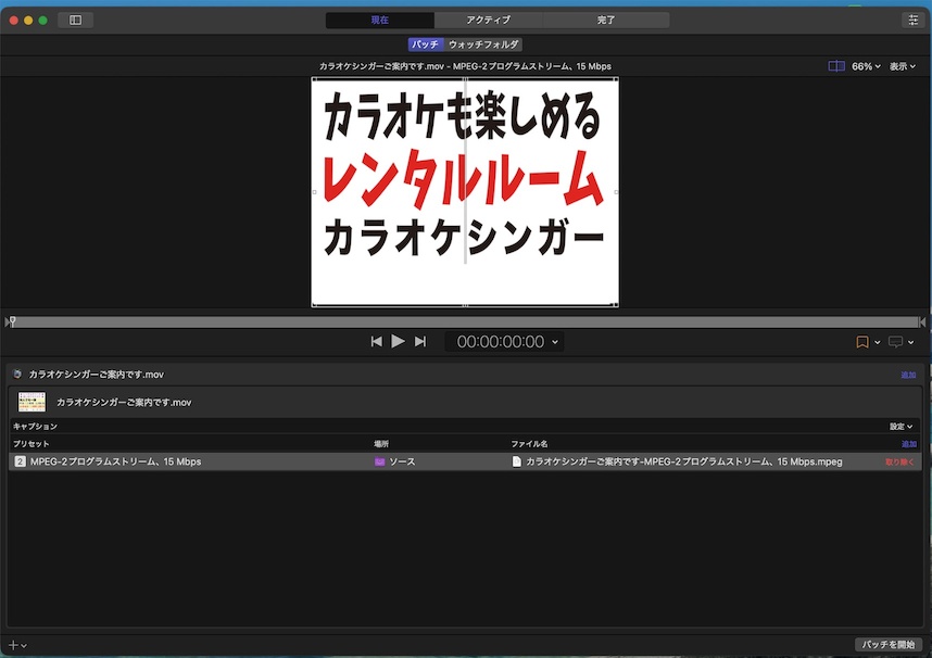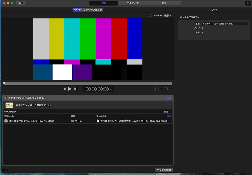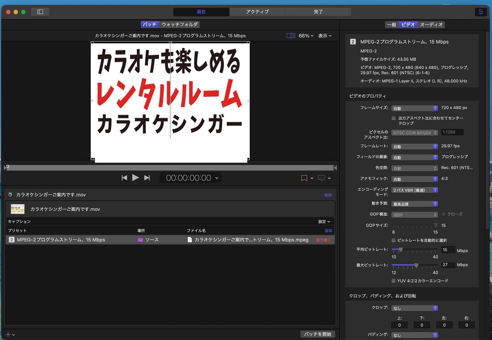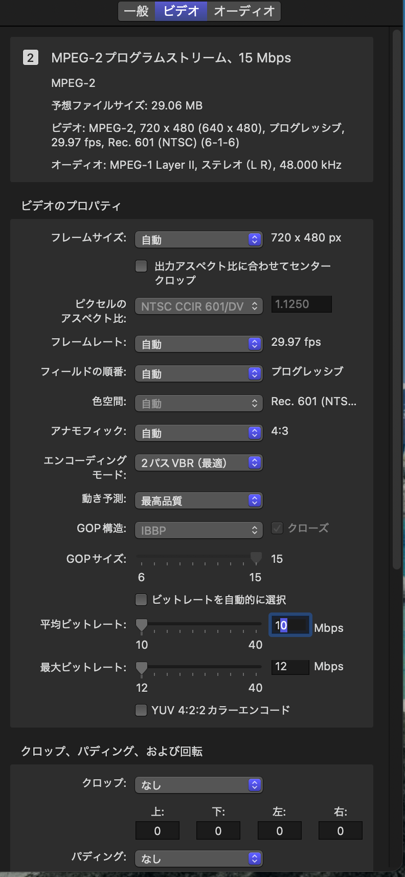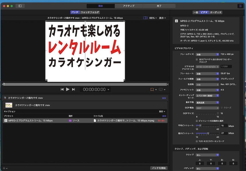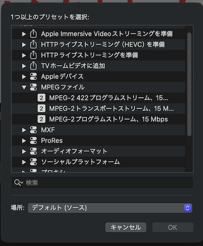 | Compressor プリセット | MPEG-2プログラムストリーム、15Mbps |