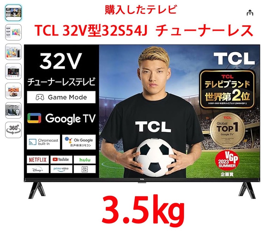 購入したテレビで感動したのは重量です。故障したSHARP 2008年製造の32インチのテレビは13.5㎏もあるのに対して、今回購入した32インチのテレビは3.5㎏と滅茶苦茶軽いです。時代の進化には驚かされます。