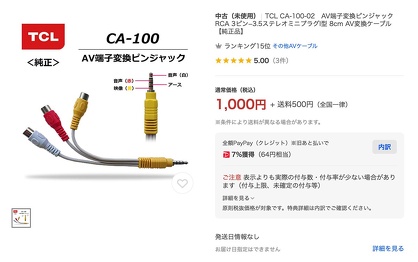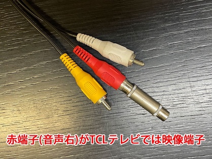 ※ 映像出力用の4極ミニプラグからRCAに変換するケーブルは、通常は上から音声左、映像、アース、音声右。それに対して、TCLテレビは上から音声左、音声右、アース、映像。
