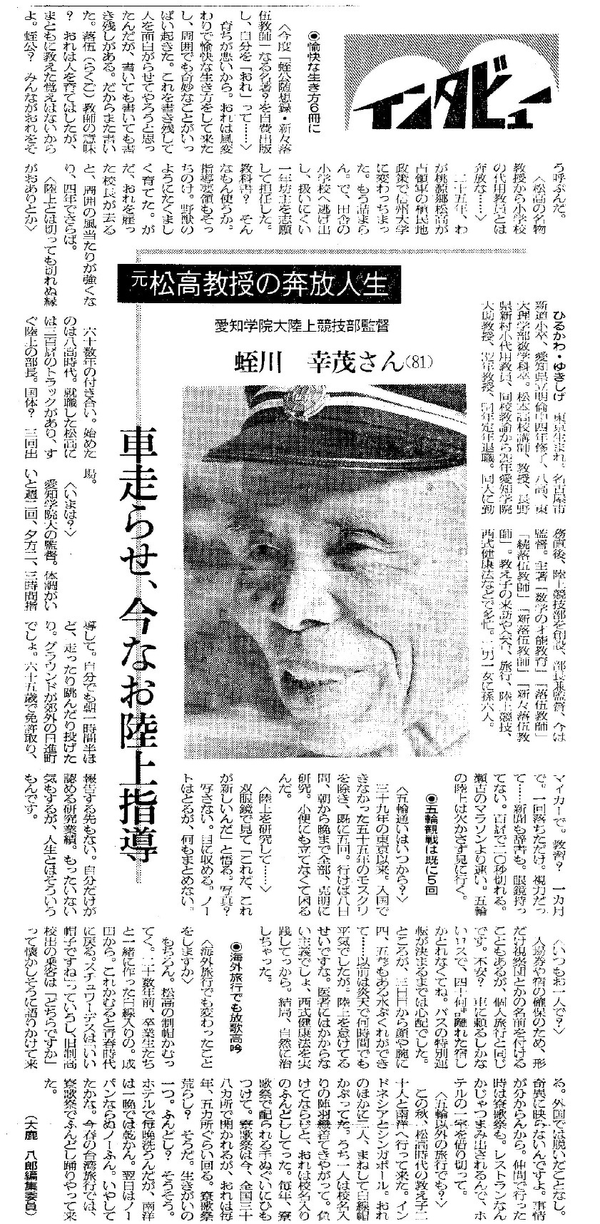 愛知学院大の監督。体調がいいと週2回、夕方2、3時間指導して。自分でも朝1時間半ほど、走ったり跳んだり投げたり。グラウンドが郊外の日進町でしょ。65才で免許取り、マイカーで。教習? 1ヶ月で。1回落ちただけ。視力だって・・・・・・新聞も辞書も。眼鏡持っていない。100mで20秒切れる。瀬古のマラソンより速い。五輪の陸上は欠かさず見に行く。