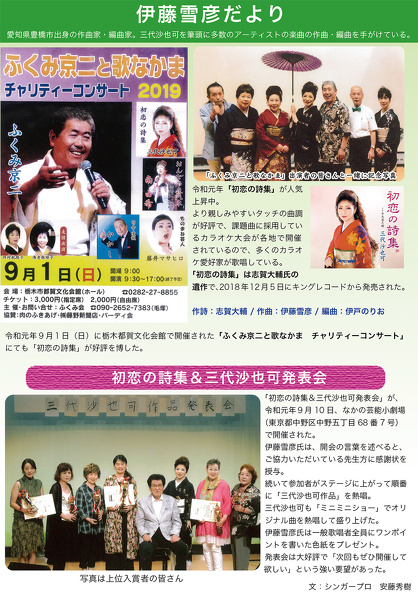 令和元年9月1日(日)に栃木都賀文化会館で開催された「ふくみ京二と歌なかま チャリティーコンサート」にても「初恋の詩集」が好評を博した。