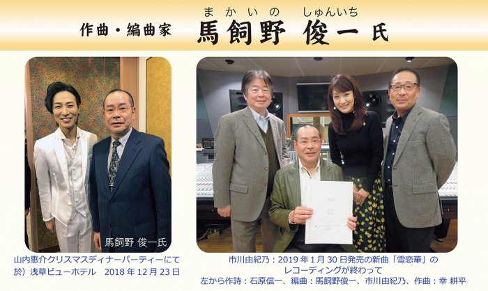 馬飼野俊一氏は、今年73才を迎えるが、24才のときと変わらないバイタリティーがある。「これまでになかったもの」を念頭に、最近では2019年1月30日に発売した市川由紀乃の新曲「雪恋華」の編曲を手がけた。二胡演奏が奏でられていて、ドラマチックで奥深くヒットの予感を感じさせる楽曲に仕上がっている。またNHK紅白歌合戦に常連出場している山内惠介の「さらせ冬の嵐」の編曲も手がけ、第33回「藤田まさと賞」を受賞(2019年1月25日 海運クラブにて授賞式)。2019年3月6日には山内惠介の新曲「唇スカーレット」が発売されるが、この楽曲の編曲も手がけた。