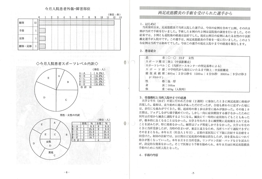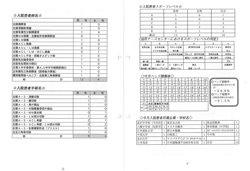 ● 右膝前十字靭帯の再建手術を受けたハンドボールの女性選手が、今度は試合中に反対側の前十字靭帯を損傷して、先月当所で前十字靭帯の再建手術を受けました。秋に行われる愛知国体に出場することを楽しみにしていただけに残念無念でした。でも今では他の入院患者と楽しく談話したり、とても明るく入院生活を送っています。