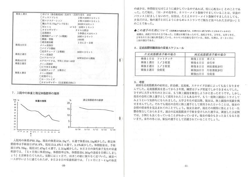 ● 入院患者で皮脂厚測定を希望する選手には、1週間に1回の割合で皮脂厚測定を実施しています。キャリパー法で測定していますが、これがなかなか難しいのです。皮膚をつかむ位置がわずか1cmでもずれると、皮脂厚計の針の示す値が 0.5mm〜1.0mm程は簡単に揺れ動いてしまいます。1週間前の測定部位と1週間後の測定部位は同位置でなければいけません。マジックでマーキング (印をつけること)でもしておかないと、測定部位を忘れてしまいそうです。それでもなんとか実施している皮脂厚測定ですが、選手には大きな励みになっているようです。特に男性選手は、筋肉の増量には神経質なほどに敏感に反応します。胸囲を測定して欲しいというので、 胸囲を測定しようとすると、午前の測定ではなくて、夕方に測定して欲しいと言ってきます。 午後のウェイトトレーニングをしっかり行った後の方が、 筋肉が増えて胸囲が増えていると考えているからです。時々、彼らは身体をカッコ良くすることに主眼をおいてトレーニングに励んでいるのか、競技能力のパフォーマンス向上に主眼をおいてトレーニングに励んでいるのか疑問に思うことがあります。でもひたむきに取り組む彼らの姿には妙に微笑ましさを感じてしまいます。